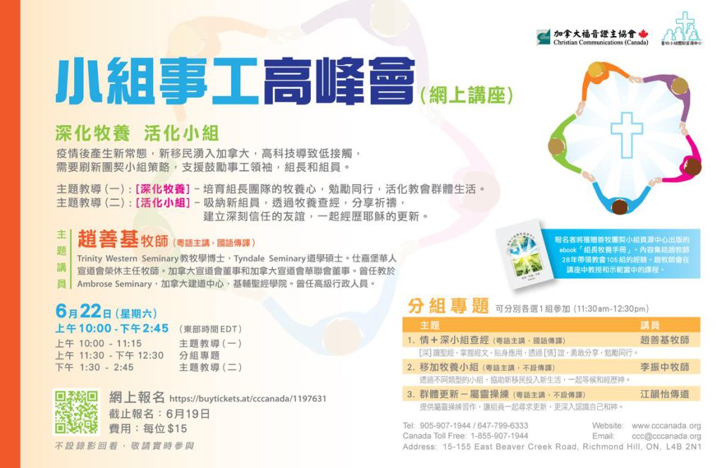 為到強化團契小組功能,粵語堂助道部鼓勵及贊助弟兄姊妹,參加6月22日星期六上午10時至下午2時45分,由加拿大福音證主協會主辦,趙善基牧師主領的 “小組事工高峰會網上講座”,聚會收費是15元,頭50位參加者,將會獲得10元教會補貼。請在以下的連結註冊和先付款,然後將你從福音證主協會的電郵收條,轉寄到 william.chan@mcbccanada.com 10元補貼將會在6月23及30主日崇拜後發放,6月19日截止報名,如有問題查詢,請聯絡 William Chan 或 Edward Tsui 弟兄。